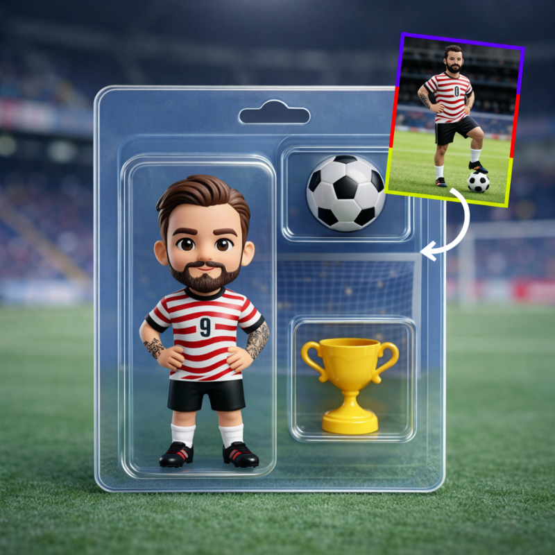 The soccer ball and trophy are fixed signature elements, symbolizing victory and passion for the game, while the figurine design and card background are fully customizable based on your photo and preferences. Create a one-of-a-kind football character that truly represents you or your loved one.